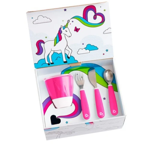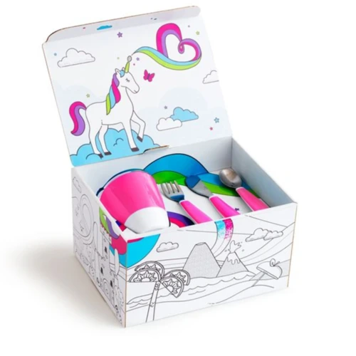 A készlet doboza unikornisos színezőt is tartalmaz, így a gyerekek kreatívan játszhatnak az étkezés előtt vagy után. Tökéletes ajándék is lehet a kicsik számára.