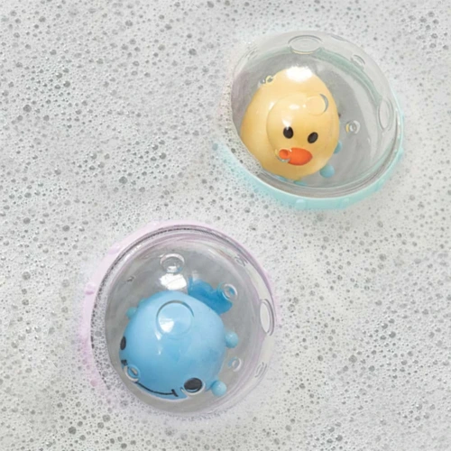 A Munchkin Float and Play fürdőjáték (2 db) igazi élménnyé varázsolja a pancsolást a legkisebbek számára. A készletben két lebegő buborék található, amelyek belsejében aranyos figurák mozognak, csillognak és zörögnek, ezzel felkeltve a babák kíváncsiságát. A színes gyűrűk szabadon forognak a buborék körül, így változatos textúrákat kínálnak, amelyek ösztönzik a felfedezést és a tapintást.