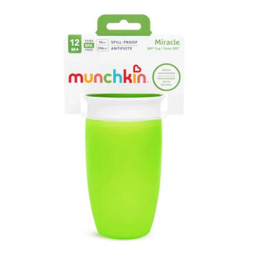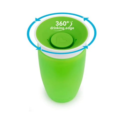 A Munchkin Miracle Cup 296 ml zöld itatópohár ideális választás a 12 hónapos és idősebb gyermekek számára, akik elkezdik az önálló ivást. A 360 fokos perem lehetővé teszi, hogy a gyermek bármelyik oldalról ihasson a pohárból, miközben a speciális szelepes tető automatikusan visszazár, így a folyadék nem folyik ki sem a pelenkázótáskában, sem az éjjeliszekrényen.