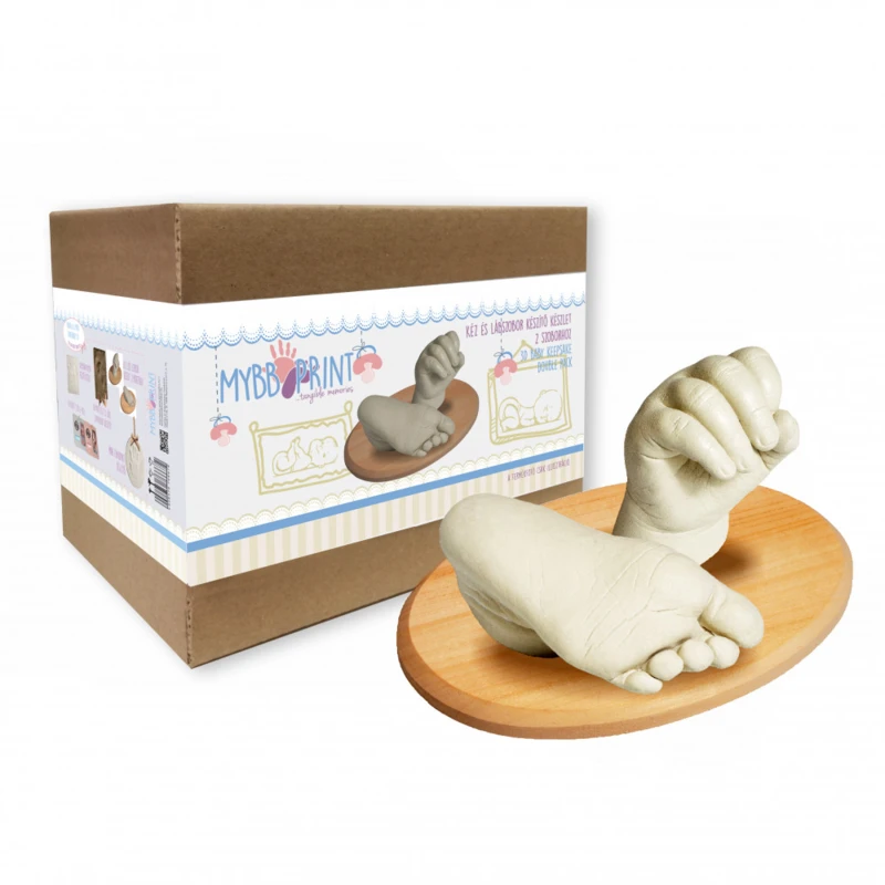 A MybbPrint talapzatos kéz- és lábszobor készítő készlettel maradandó emléket készíthetsz kisbabád kezéről vagy lábáról. Egyszerű, gyors és biztonságos használat, 0–3 éves korig, két szoborhoz elegendő alapanyaggal.
