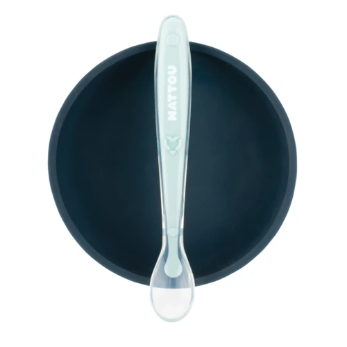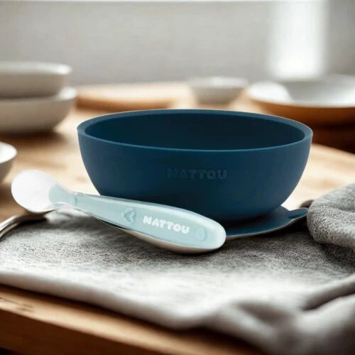 Nattou szilikon étkészlet 2 részes, mélytányérral, sötétkék–világoskék – tapadókorongos mélytányér és kanál, BPA-mentes szilikonból. Biztonságos, tartós, könnyen tisztítható.