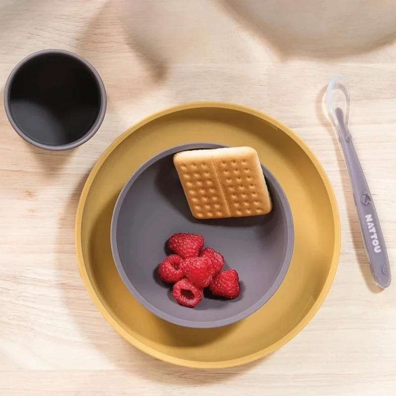 Nattou szilikon étkészlet 4 részes pohárral – tartalmaz két tálat, kanalat és poharat. Puha, BPA-mentes szilikonból készült, biztonságos, csúszásmentes és mosogatógépben mosható.