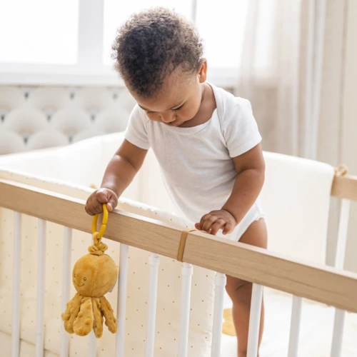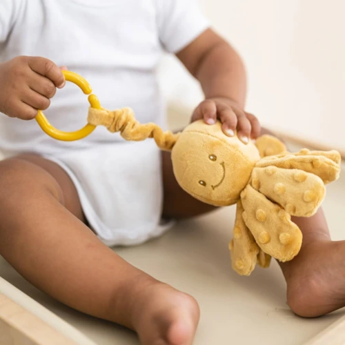 Nagyon cuki kis polip, ami felhúzva vibrálva megy felfelé. Gyorsan az újszülöttek és csecsemők legjobb játszótársa lesz. Játékos és fejlesztő játék egyaránt, serkenti a baba motoros készségeit és veleszületett prehenziós reflexeit. A csápok mind puhák, pont akkorák, mint a babák kicsi kezei, enyhe dudorokkal, amelyek felkeltik a kíváncsiságát és a tapintását. Koraszülötteknek is alkalmas, ideális a baba stimulálására.