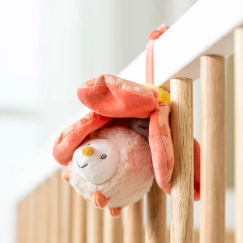 Nagyon cuki kis játék, ami felhúzva vibrálva megy felfelé. Gyorsan az újszülöttek és csecsemők legjobb játszótársa lesz. Játékos és fejlesztő játék egyaránt, serkenti a baba motoros készségeit és veleszületett prehenziós reflexeit. Aranyos kialakítás fülekkel, karokkal és lábakkal a megfogáshoz. Koraszülötteknek is alkalmas, ideális a baba stimulálására. A praktikus szalagoknak köszönhetően a járókára, kiságyra vagy babakocsira is rögzíthető.