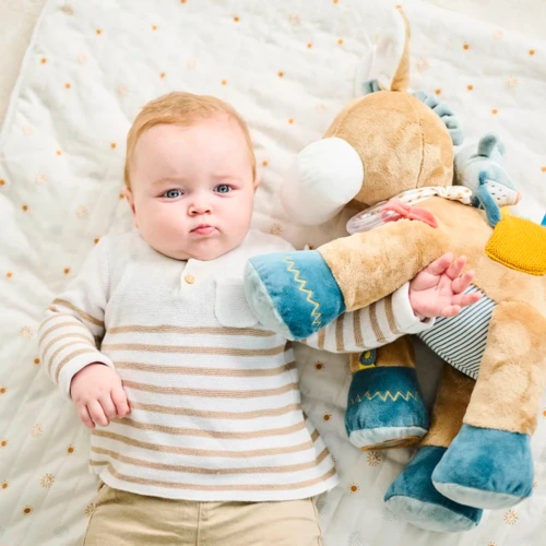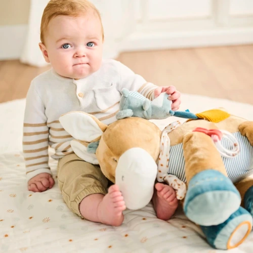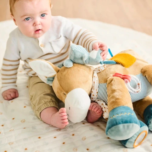 Ez a gyönyörû plüss szamár különféle játékokkal több órányi játékidőt biztosít a babának! Az olyan szórakoztató tevékenységek, mint a beépített csörgő, sípoló, szilikon rágóka, tükör és címkék, arra ösztönzik a babát, hogy felfedezze és megragadja a játékokat. Ily módon serkentik gyermeke megfogási reflexeit és motoros fejlődését. A Leo szamár bújós játék puha bundája szintén biztonságos és megnyugtató érzést nyújt. Hûséges játéktárs, amely születéstől fogva örömet és kényelmet hoz, valamint remek ajándékötlet a baba számára.