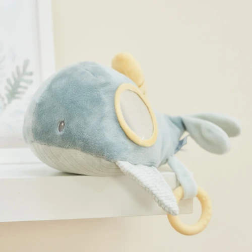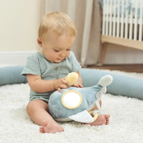 A bálnának több szórakoztató tevékenysége van: zörgés-csikorgás-papírropogás és különféle megfogási lehetőségeket lehet felfedezni. A különösen puha anyagok és a különböző textúrák serkentik a tapintóérzék fejlődését és felfedezésre hívnak. A könnyen megfogható elemek ideális társsá teszik a kedves bújós játékot babák és újszülöttek számára.