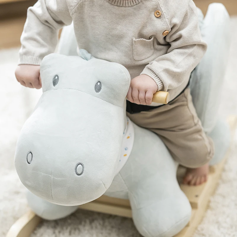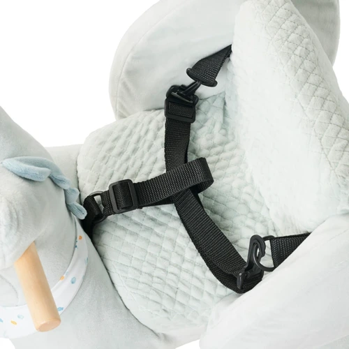 Puha plüss borítású, biztonsági övvel ellátott hintázó állatka, amely stabil ülőrésszel és kényelmes kialakítással nyújt biztonságos szórakozást a kicsiknek. 10–36 hónapos gyermekek számára ajánlott, strapabíró, 100% poliészter anyagból.