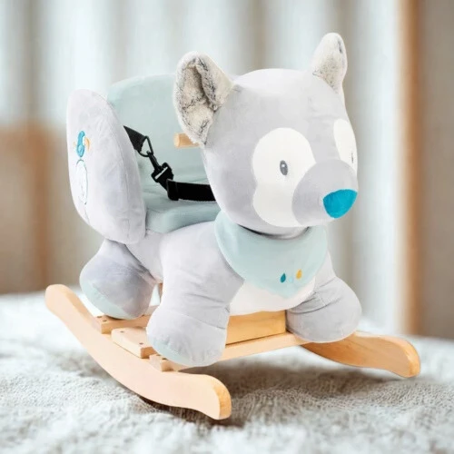Puha plüss borítású, biztonsági övvel ellátott hintázó állatka, amely stabil ülőrésszel és kényelmes kialakítással nyújt biztonságos szórakozást a kicsiknek. 10–36 hónapos gyermekek számára ajánlott, strapabíró, 100% poliészter anyagból.