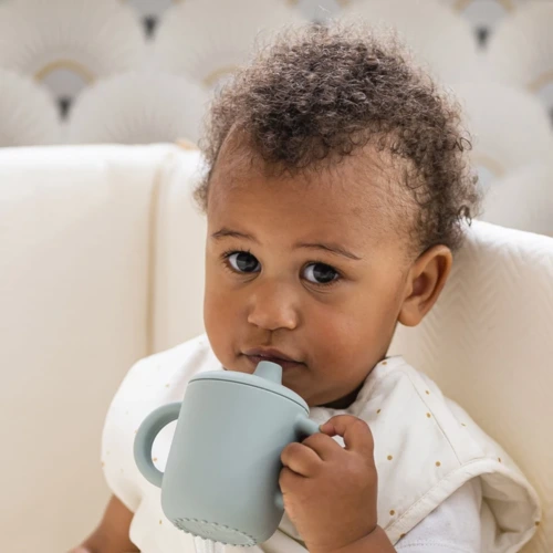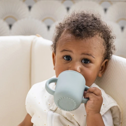 A stílusos szilikon ivópohár lehetővé teszi, hogy babája önállóan és kiömlés nélkül ihasson. A csésze két praktikus fogantyúval rendelkezik a kis kezek számára, egy szorosan záródó fedéllel és egy hozzáillő puha szilikon szívószállal, hogy megkönnyítse az ivást. A fedél és a szívószál speciális biztonsági zárral is rendelkezik, így gyermeke nem tudja véletlenül kinyitni. Ivás után a csésze könnyen tisztítható mosogatógépben és a mellékelt kefével.