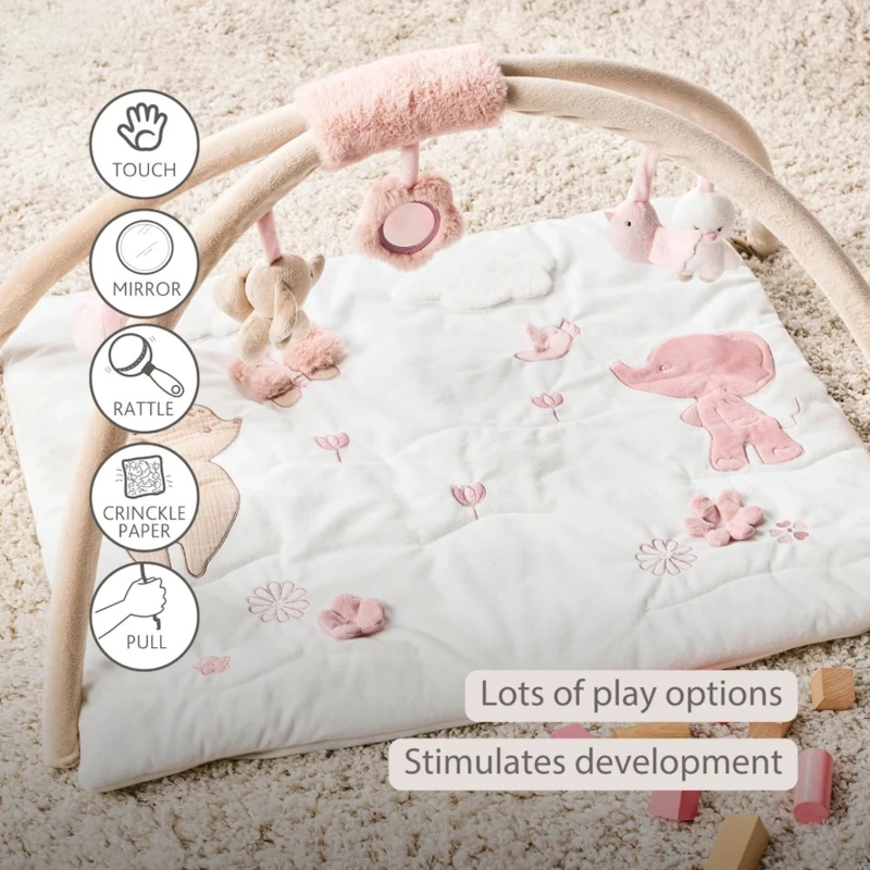 A Nattou boltíves játszószőnyeg egy igazi felfedezések világa a babád számára. A puha, vastag bélés optimális kényelmet biztosít, míg a vidám játékokkal teli, kivehető boltívek arra csábítják a kis kezeket, hogy megragadják és felfedezzék a játékokat. A gyûrött papír, a nyikorgó, a csörgő, a gombok és egyebek stimulálják az összes érzékszervet, és játékosan fejlesztik a finommotoros készségeket. Akár nyugodtan játszik gyermeked, akár kíváncsian fedezi fel a figurákat, ez a játszószőnyeg végtelen szórakozást és biztonságot nyújt. Egy gyönyörû és praktikus babaajándék, amely tökéletesen illik bármilyen gyerekszobába.