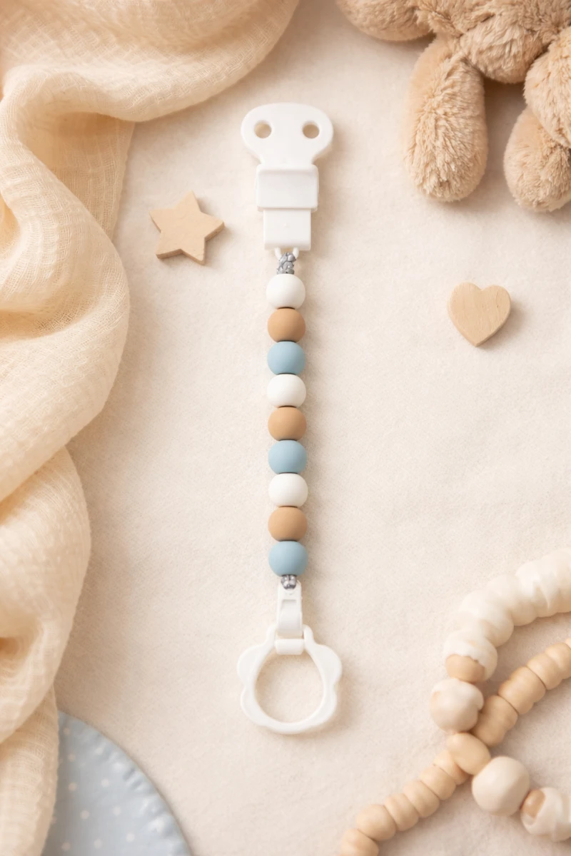 Ez a szilikon cumilánc tökéletes megoldás a baba cumijának biztonságára. Könnyen rögzíthető egy állítható csipesszel. Méretek: 27,5 x 3,3 x 1,7 cm.