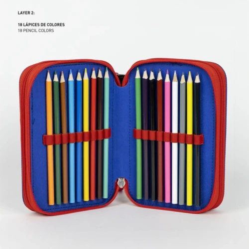 Tartalma: - 18 db színes ceruza - 18 db színes filctoll - 1 db grafit ceruza - 1 db hegyező - 1 db radír - 1 db kék toll - 1 db piros toll - 1 db vonalzó - 1 db órarend - 1 db olló