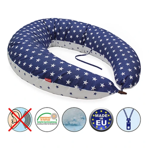 A külső huzat 100% pamut és szintén Ökotex minősítéssel rendelkezik. A párna vége gombbal van ellátva a könnyebb összeerősítés végett, a közepén egy párban kötöző, ami a szoptatáshoz és a baba pihenéséhez nyújt segítséget.