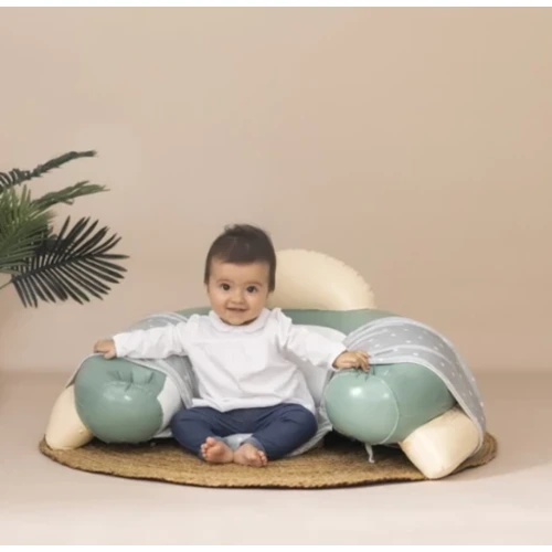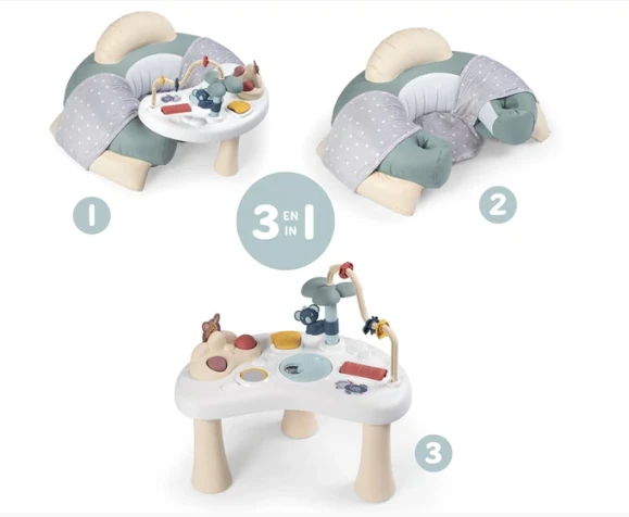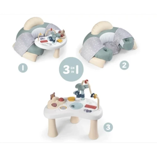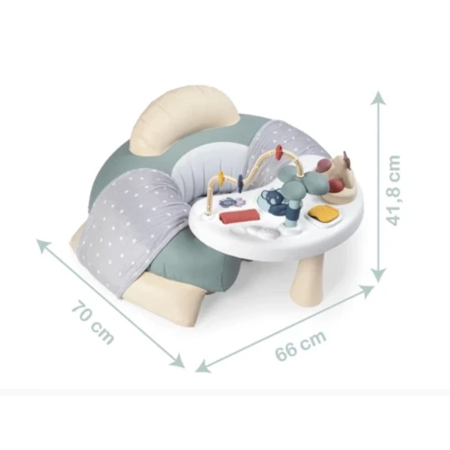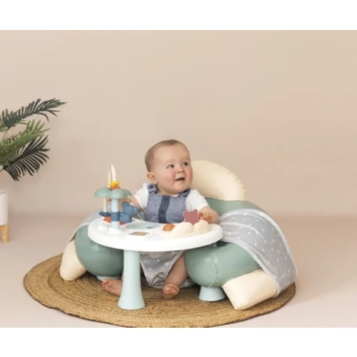 A pasztell színű Smoby Little Cosy készségfejlesztő játszófotel egy készségfejlesztő asztalkából és egy nagyon puha és kényelmes, felfújható fotelből áll.