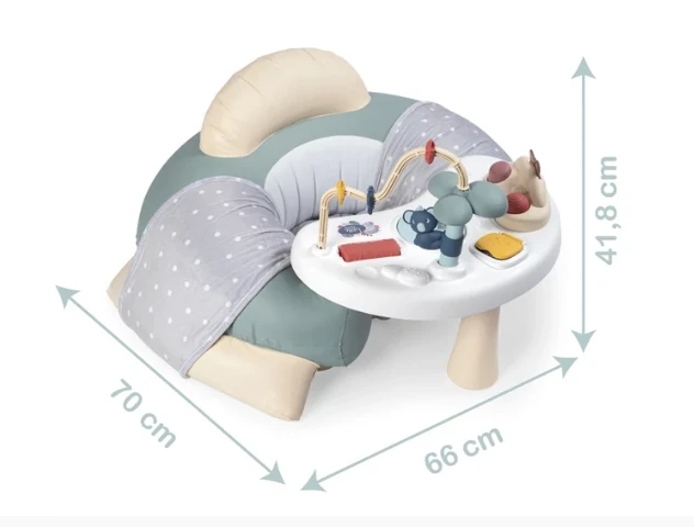 A pasztell színű Smoby Little Cosy készségfejlesztő játszófotel egy készségfejlesztő asztalkából és egy nagyon puha és kényelmes, felfújható fotelből áll. A fotel kartámlája és ülőrésze textil huzattal van bevonva és kiesésgátlóval van ellátva, hogy a kicsi ne csúszkáljon a fotelben. A pasztell színű asztal és a rajta lévő aranyos játékok hosszasan lekötik a kicsi figyelmét és fejlesztik képességeit. A mókás asztalkán kenguru bújócska, koala a fán, kockahúzogató játék és elforgatható tükör is található, melyekkel szuper szórakozást kínálnak a piciknek. Az asztalka és a fotel külön-külön is használható.