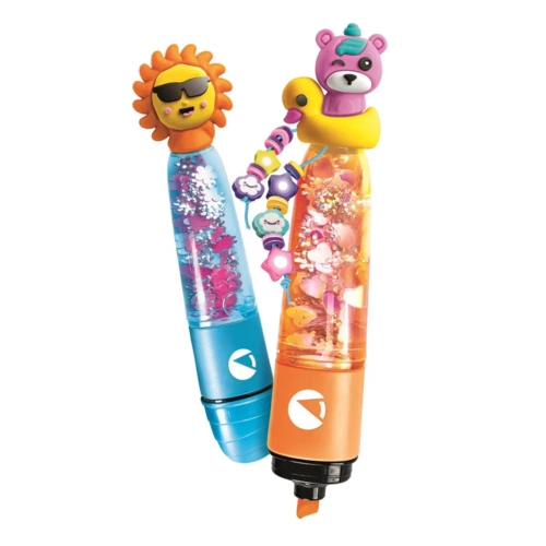 - műanyag alap és tölcsér - 2 db mini szövegkiemelő toll 2 színben kupakkal - 2 db átlátszó, kidekorálható tolltest - 2 db fehér gumidugó - 3 tasak különféle formájú és színű dekoráció - 1 tasak színes karika és 1 tasak zsinór - színes gyöngyök, 2 db gumifigura - használati útmutató - 6 éves kortól ajánlott