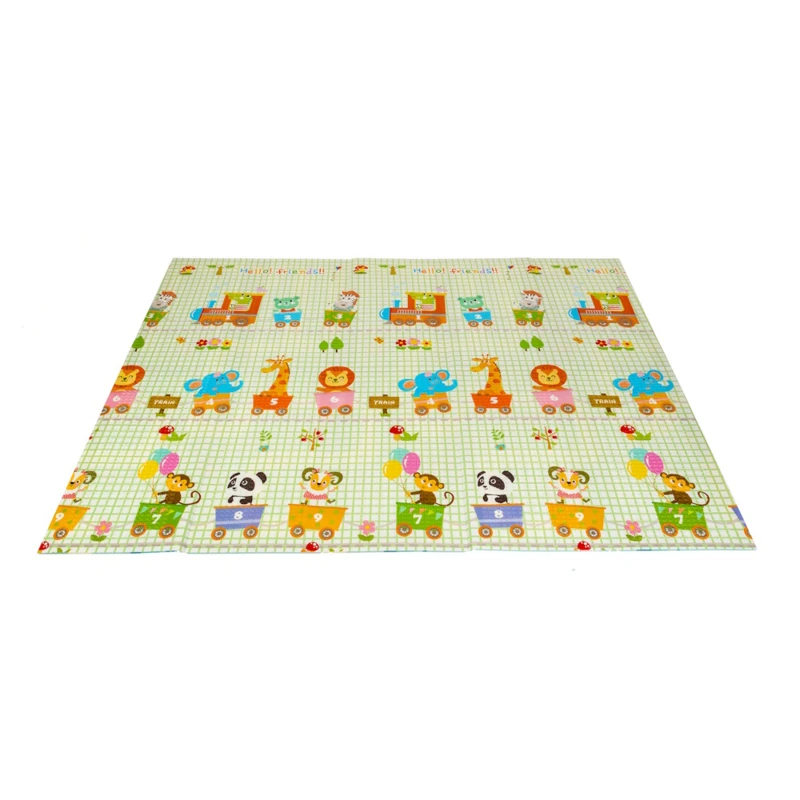 A kétoldalú összehajtható szőnyeg színes és változatos mintákat és textúrákat kínál, amelyek segítik fejleszteni a babák látását és tapintását. Tele van állatok képeivel, amelyek támogatják a legfiatalabb felhasználók intellektuális és motoros fejlődését.
