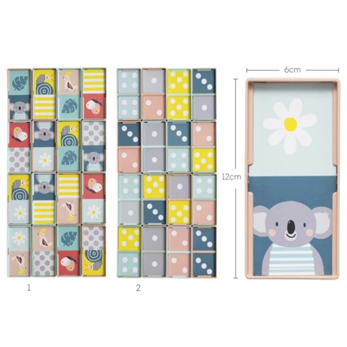 A játék segíti a finom-motorika, a szem-kéz koordináció, valamint a kognitív képességek fejlődését. Az oktató jellegű dominó során a gyermek könnyedén megtanulja a formákat, számokat és színeket.