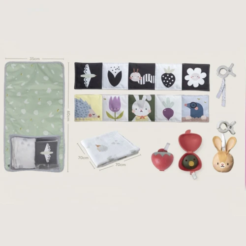 A készlet tartalmaz egy nagy bambusz textil pelenkát, egy hordtáskává összehajtható pelenkázólapot (amely tartalmazza a készlet összes termékét), két mûanyag csipeszt, egy eper formájú cumitartó tokot, egy csörgő nyuszit és egy puha kétoldalas bébikönyvet.