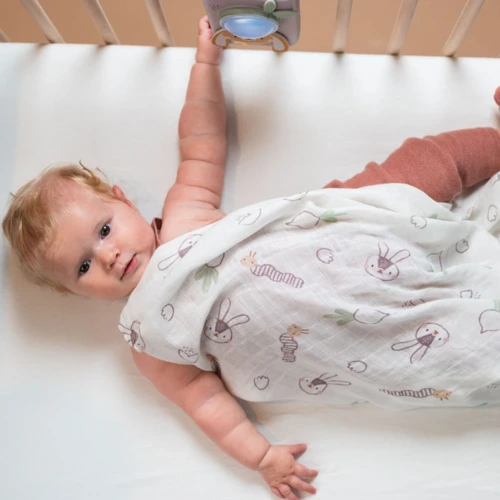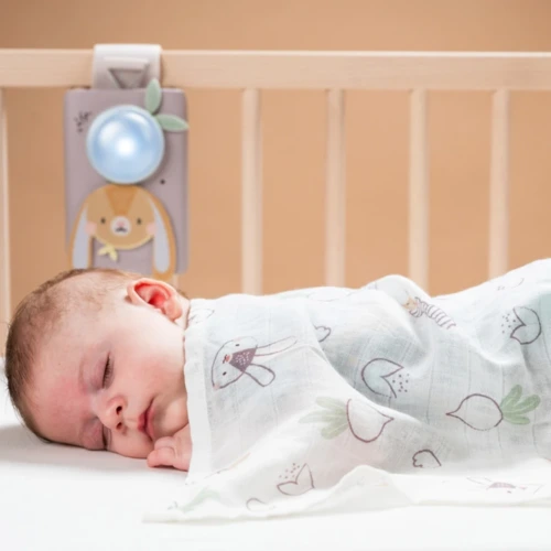 Nyuszi alakú zenélő éjjeli fény hangérzékelővel, és mellé bambusz‑pamutt takaró: sírás vagy zaj hatására automatikusan elinduló nyugtató dallamokkal és lágy fénnyel segíti a baba nyugodt alvását. Újszülött kortól használható.