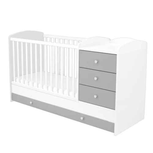 Timba Erik Maxi kombiágy ezüst-fehér, 5 fiókos pelenkázószekrénnyel. 3 fokozatban állítható fekvőfelület, kivehető oldalpálcák. Átalakítható babaágyból junior ággyá és éjjeli szekrénnyé. Méret: 104,4×180,4×76,5 cm.