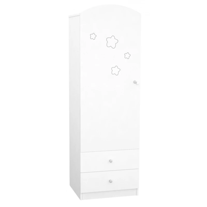 A bútor akasztós és polcos tárolórészekkel rendelkezik, így jól variálható a gyermekruhák, játékok vagy egyéb kiegészítők tárolása szempontjából. Az ajtón található íves felső rész és a finoman kialakított csillagmintás mart díszítés harmonikusan ötvözi a funkcionalitást és a gyermeki játékosságot.