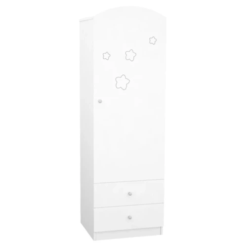 A szekrény egyajtós kialakítása mögött tágas tárolóhely található, amely kiválóan alkalmas ruhaneműk, játékok vagy egyéb kiegészítők rendszerezésére. A három görgős sínes fiók könnyen kihúzható, csendesen működik, és elegendő helyet kínál a kisebb tárgyak tárolására.