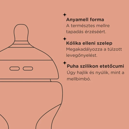 • Igény szerinti etetés: A puha szilikon cumi úgy hajlik és nyúlik, mint egy mellbimbó, és lehetővé teszi, hogy a baba kényelmesen, saját tempójában egyen.