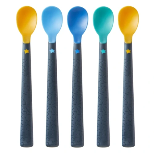 Az 5 darabos, divatos színû etetőkanalak közül a kisfiúk és kislányok is megtalálják a kedvencüket. Kifejezetten az első igazi szilárd falatokhoz tervezve. A puha, rugalmas, lapos fej gyengéd a kis szájacskákhoz és az érzékeny ínyekhez, így nem okoznak kellemetlenséget, miközben a finom falatok célba érnek.