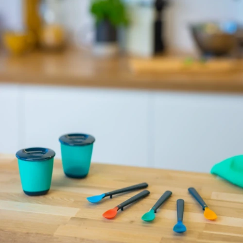 A hosszú nyél segítségével könnyen elérjük a bébiételes üveg vagy bármely edény alját. Csúszásgátlóval ellátott kialakításának köszönhetően nem csúszik bele a tálkába.