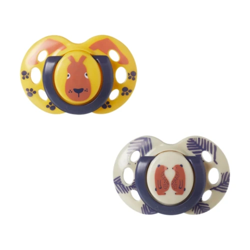 A Fun kollekció élénk, színes és játékos mintáival igazán különlegessé teszi a cumikat – a Friends változat kedves szafari állatos motívumokkal mosolyt csal a kicsik és a szülők arcára. A pajzson található kis szellőzőnyílások elősegítik a levegő áramlását, így csökkentik a bőrirritáció kialakulásának esélyét.