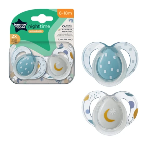 Tommee Tippee CTN Night játszócumi 2 db – 6-18 hó. Szimmetrikus, ortodontikus kialakítás, világító fogantyú az éjszakai könnyebb megtaláláshoz, BPA-mentes, biztonságos.