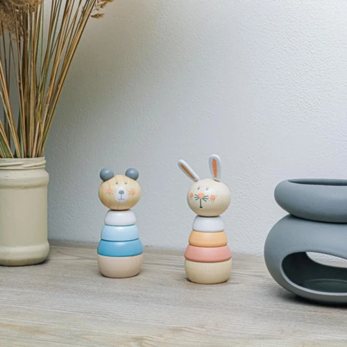 Az egymásra rakható játék egy fadarabokból álló készlet, amely szétszedhető és összerakható. A figura aranyos kialakítása magával ragadja a gyermeket, és játékos formában segíti a motoros készségek és a térbeli gondolkodás fejlesztését. A gyermek megtanulja a méretek felismerését és az alapvető számolást is. A játék kiváló minőségû bükkfából készült és vízbázisú festékekkel van festve.
