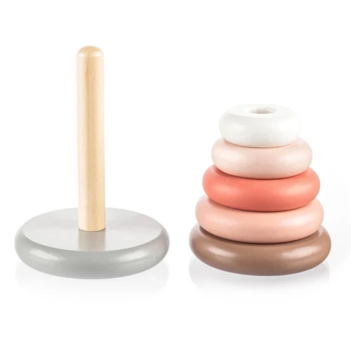 Összerakható, szétszedhető, válogatás és tucatnyi különböző kombináció – ezek a fából készült rápattintható gyûrûk a kíváncsi felfedezők számára. A készlet 6 db különböző méretû darabból áll, melyek tetszés szerint egymásra rakhatók. A játék hosszú ideig lefoglalja a gyermeket, és segít új ismeretek elsajátításában, például színek, számok és méretek elsajátításában. A gyûrûk segítik a motoros készségek, a koordináció és a térbeli gondolkodás fejlesztését.