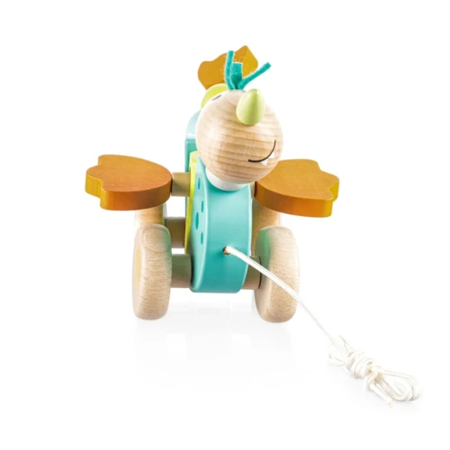 A húzható játék tökéletes megoldás azoknak a gyerekeknek, akik járni tanulnak és motivációra van szükségük. Séta közben egy egyszerû mechanizmus segítségével a szárnyak és a farok csapkodnak, így a gyerek órákon át szórakoztatja. A játék fejleszti az alapvető érzékszerveket, motoros készségeket és koordinációt. A strapabíró kerekeknek köszönhetően a játék nem csak otthon, hanem kültéren is használható. A játék természetes bükkfából készült, a használt színek vízbázisúak.