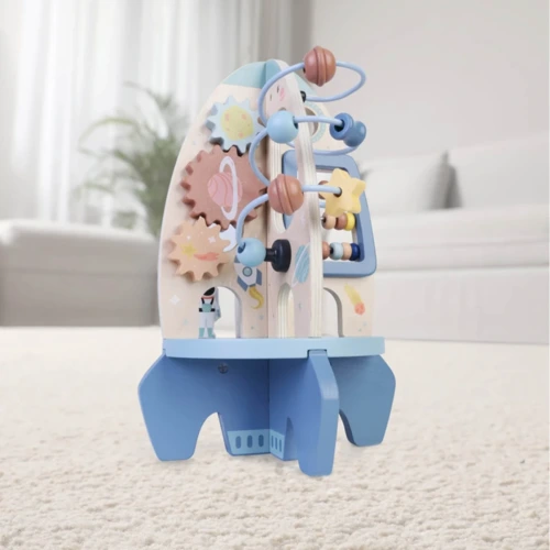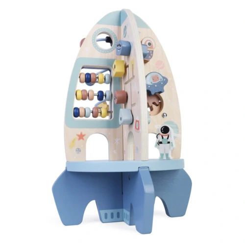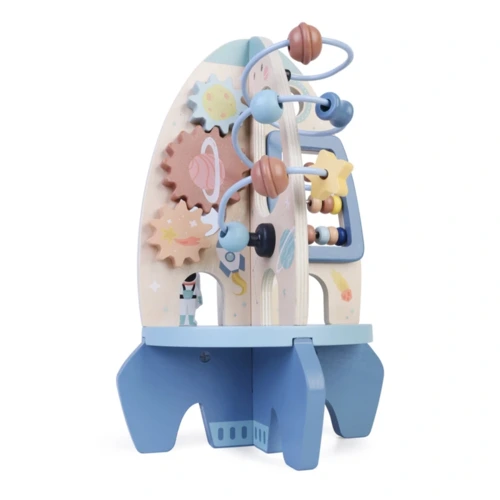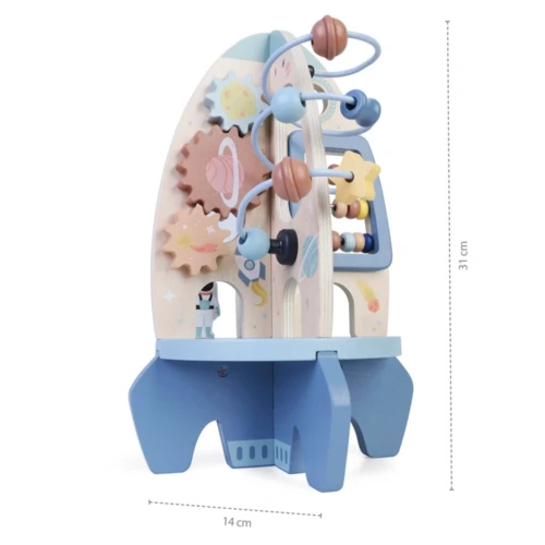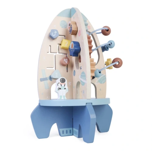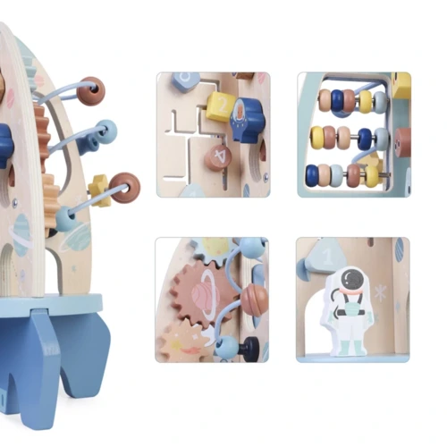 A rakéta különféle játékelemeket tartalmaz, amelyek szórakoztatják és tanítják gyermekeit. A labirintusban színes gyöngyöket csúsztathatnak végig a cikk-cakk dróton, ami fejleszti finom-motorikát és szem-kéz koordinációt. A csúszó fogaskerekeknek köszönhetően a gyerekek megismerkednek az ok-okozat elvével. Mozgathatják a golyókat a pulton, hogy gyakorolják a térbeli tájékozódást és megtanuljanak számolni.