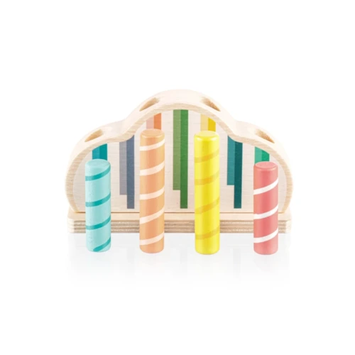Színes csapok vannak rögzítve egy színes, rugóval ellátott fa alapba. Ha ezeket a csapokat finoman megnyomják, kioldódnak, és a rugó lehetővé teszi, hogy kiugorjanak. A játék fejleszti a motoros készségeket, a koordinációt és a koncentrációt, így ideális a korai tanuláshoz. Természetes bükkfából és vízbázisú festékekből készült.