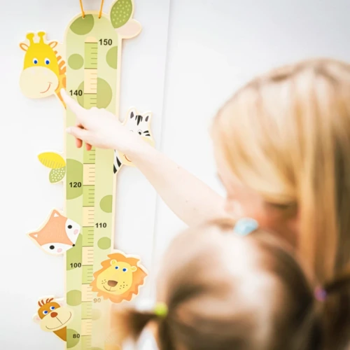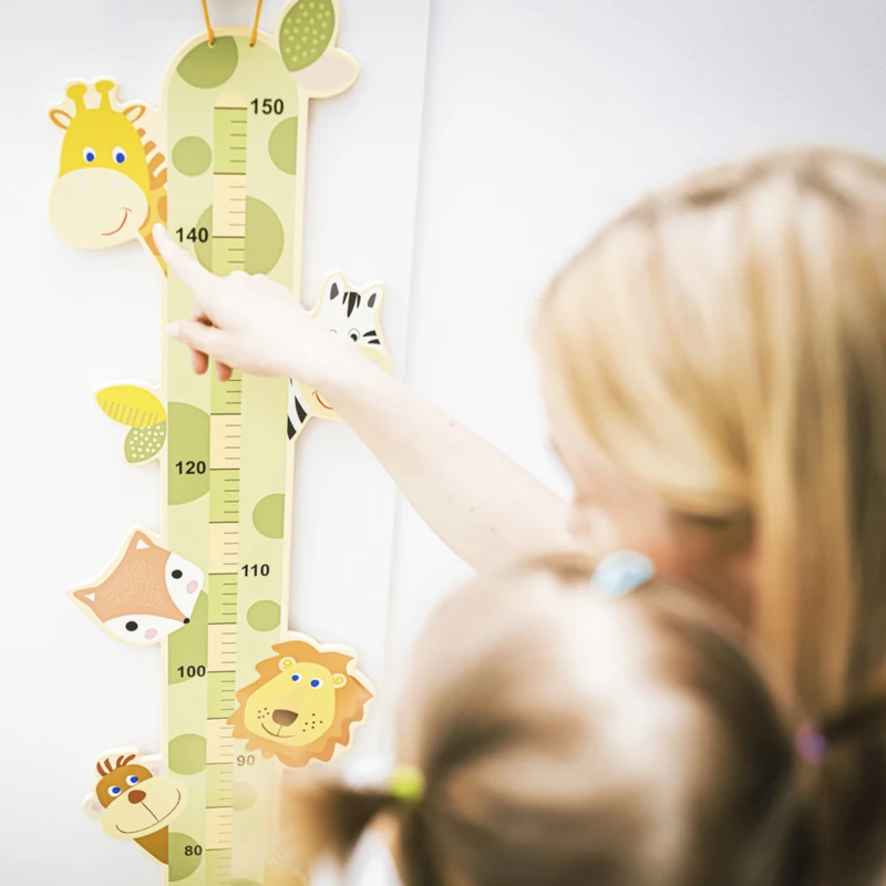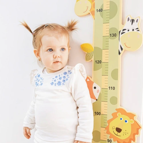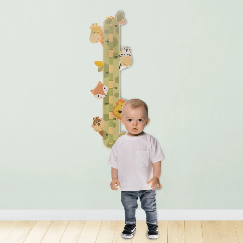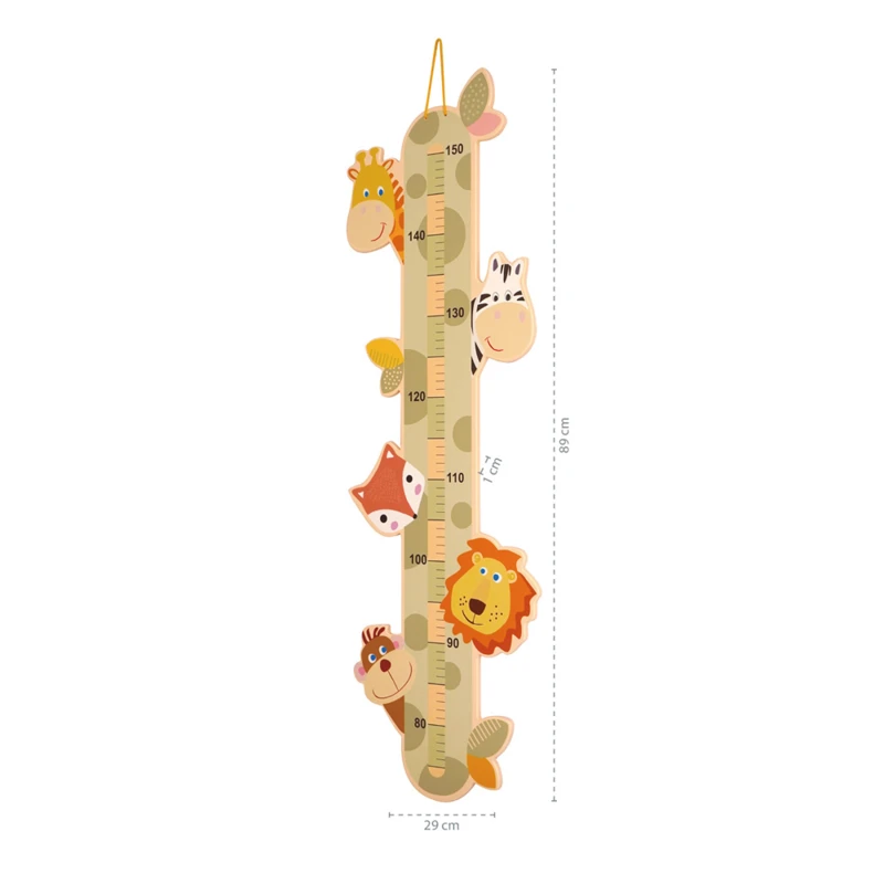Aranyos fa magasságmérő állatbarátokkal gyermekeknek, akik minden centimétert ellenőriznek, hogy megnőtt-e. A mérő kiváló minőségû fából készült, és az összes használt festék biztonságos az egészségre és vízbázisú. A felső részben található praktikus hurok lehetővé teszi a mérő falra vagy ajtóra akasztását. A mérő addig mûködik, amíg a gyermek el nem éri a 150 cm-t.