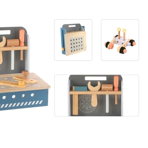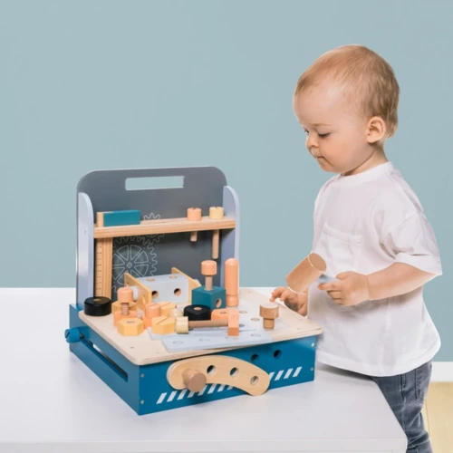 Kompakt fa munkapad gyerekeknek sok alkatrésszel. Fejleszti a kézügyességet, kreativitást és koordinációt. Tartós fából, biztonságos festékkel készült. Mérete: kb. 30 x 30 x 28 cm.
