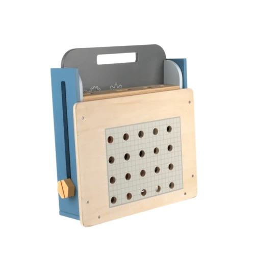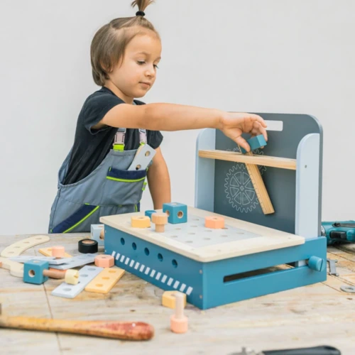 A kompakt összecsukható munkapad számos fa alkatrészt tartalmaz a lyukakkal ellátott falemezektől a csavarokig és anyákig. A rengeteg összecsukási lehetőségnek köszönhetően serkenti a gyermek elméjét és támogatja a kreatív gondolkodást. Fejleszti a finom-motorikát és az alapvető kézkoordinációt is. Az összecsukható munkapad kiváló minőségû fából és vízbázisú festékekből készül.