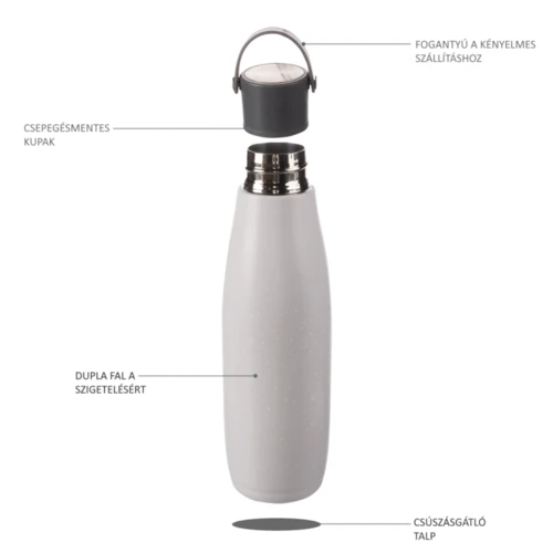 Hideg és meleg italok tárolására alkalmas, minőségi rozsdamentes acél, korrózió- és páralecsapódásálló, szoros kupak, akasztó, ûrtartalom 480 ml.